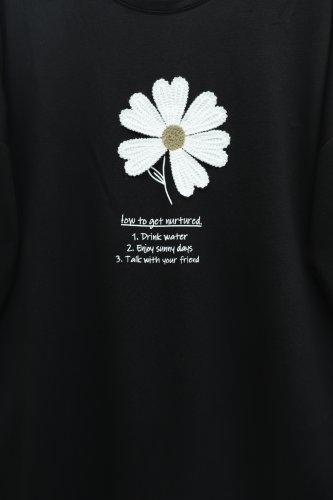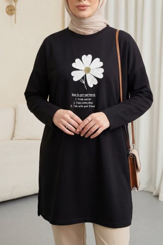 • Önü Çiçek Nakışlı Bisiklet Yaka Penye Tunik Siyah