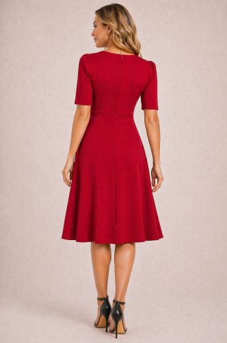 • Kadın kısa kollu asimetrik yaka detaylı midi janjan krep elbise