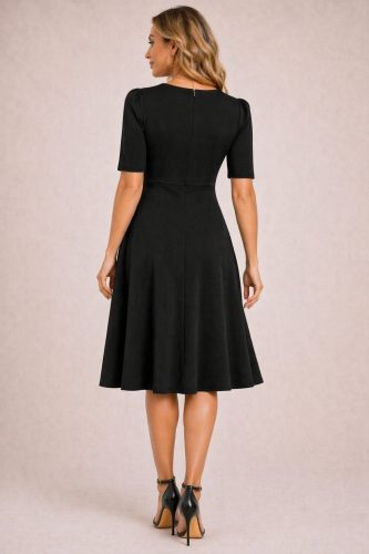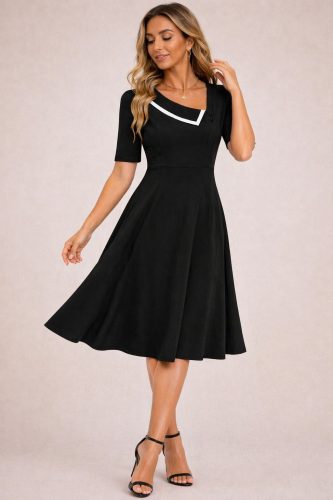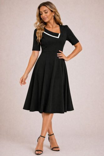 • Kadın kısa kollu asimetrik yaka detaylı midi janjan krep elbise